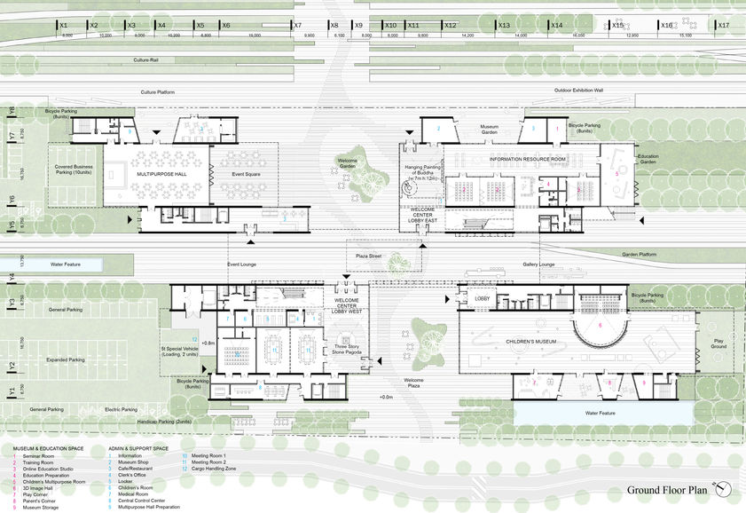 The site suggests important connective axes in two directions. As a historical boundary between neighborhoods on the east and west, the project must provide a connective border condition between the two. As the central site along a linear masterplan ranging from north to south, the project must provide continuity and connectivity derived from the existing railway morphology. Our proposal acknowledges these two key connective requirements, but argues that they are not the same, and cannot be dealt with through the same spatial devices. East-west, the project provides a gateway and a series of spatial thresholds to create a sense of transition, complexity, and interface between different conditions. East-west the project is a series of perforated, layered facades that control view (of local monuments and edifices) and access. Passing north-south, park-goers may slip between the spatial layers of the project, providing a sense of continuous movement. The project provides a monumental, complex border of interaction between Jinju Avenue and the new cultural street, while providing a continuous linear axis between the aerospace science museum and railway park to the north and south.